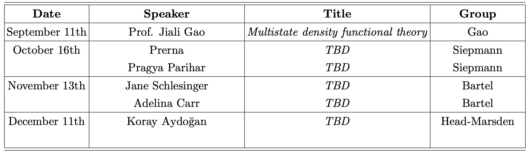 If you are at UMN and interested in receiving news about the Chemical Theory Center, contact Kade Head-Marsden at khm@umn.edu.